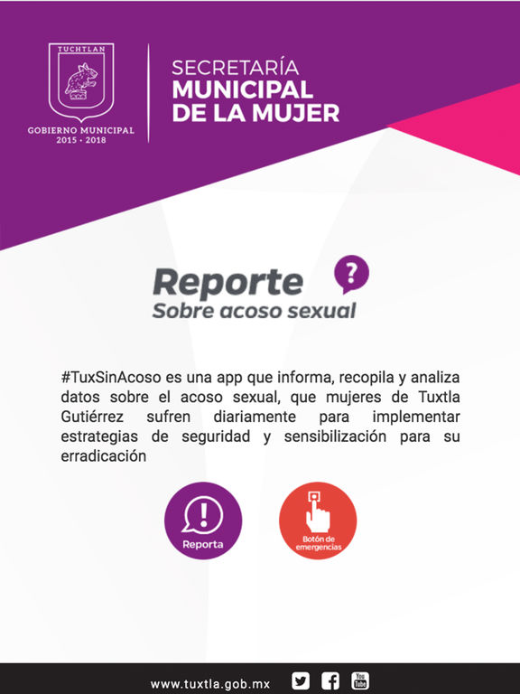 Tuxtla Gutiérrez, Chiapas, 30 de noviembre.- Esta aplicación tiene por objetivo, menciona la titular de la Secretaría para la Igualdad de Género, la Mtra. María Enriqueta Burelo Melgar recopilar información a través de denuncias de mujeres, que permitan mapear zonas de Tuxtla Gutiérrez con ocurrencia de acoso sexual callejero. A través de un formulario sencillo, de manera anónima y detallada, las usuarias tuxtlecas o mujeres que transitan por la ciudad podrán realizar su denuncia del ataque recibido con el propósito de generar estadísticas y estrategias para su erradicación.