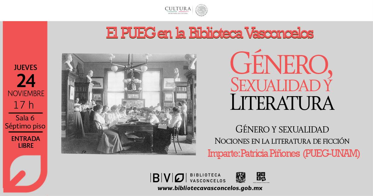 Con motivo de la reciente apertura de una colección temática sobre género en el Piso 7 de la Biblioteca Vasconcelos, el Programa Universitario de Estudios de Género (PUEG) de la Universidad Nacional Autónoma de México (UNAM) propone un programa de conversaciones con el público alrededor de la relación entre literatura, género y sexualidad. Estas sesiones estarán coordinadas por especialistas del PUEG en los temas que nos convocan en un formato de diálogo con los y las asistentes y con un tono divulgativo y accesible que permita cumplir nuestro principal objetivo de familiarizar al público con las siguientes preguntas. ¿Cómo se lee con perspectiva de género? ¿Qué significa una lectura feminista? Y en todo caso, ¿qué entendemos por género y sexualidad? ¿Qué relación tienen estas dos nociones con la literatura de ficción? ¿Tiene sentido hablar de escritura de mujeres? ¿Y de literatura lésbica, gay y queer?