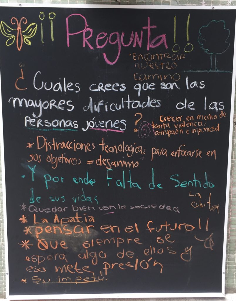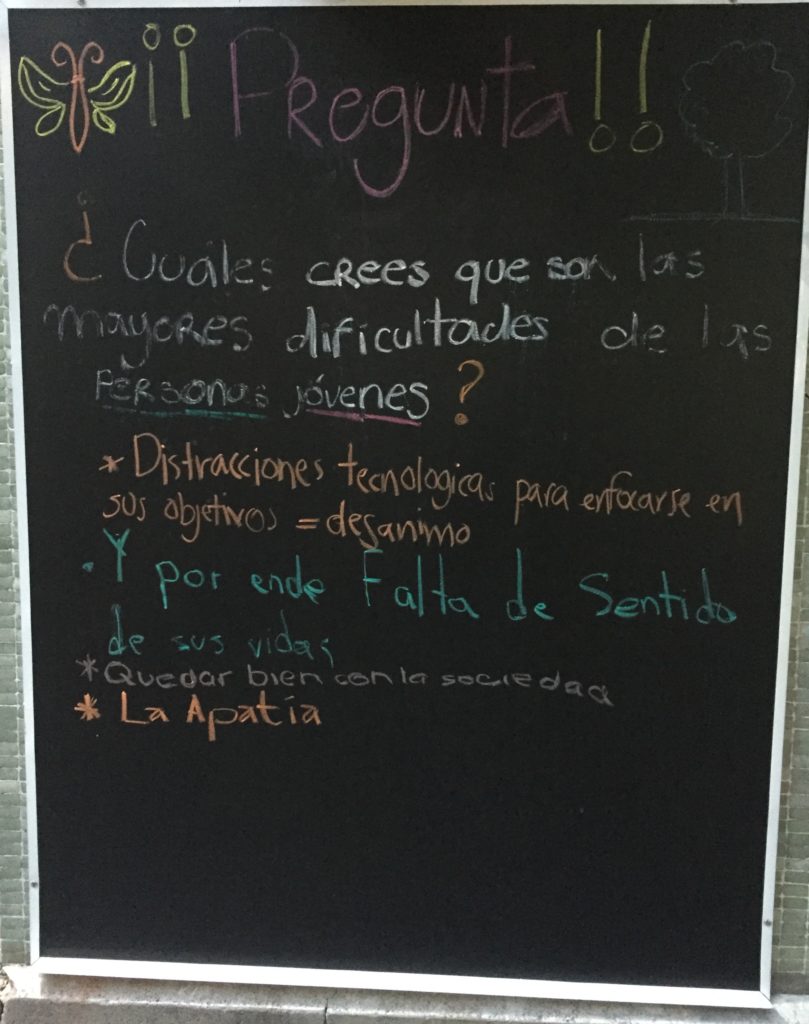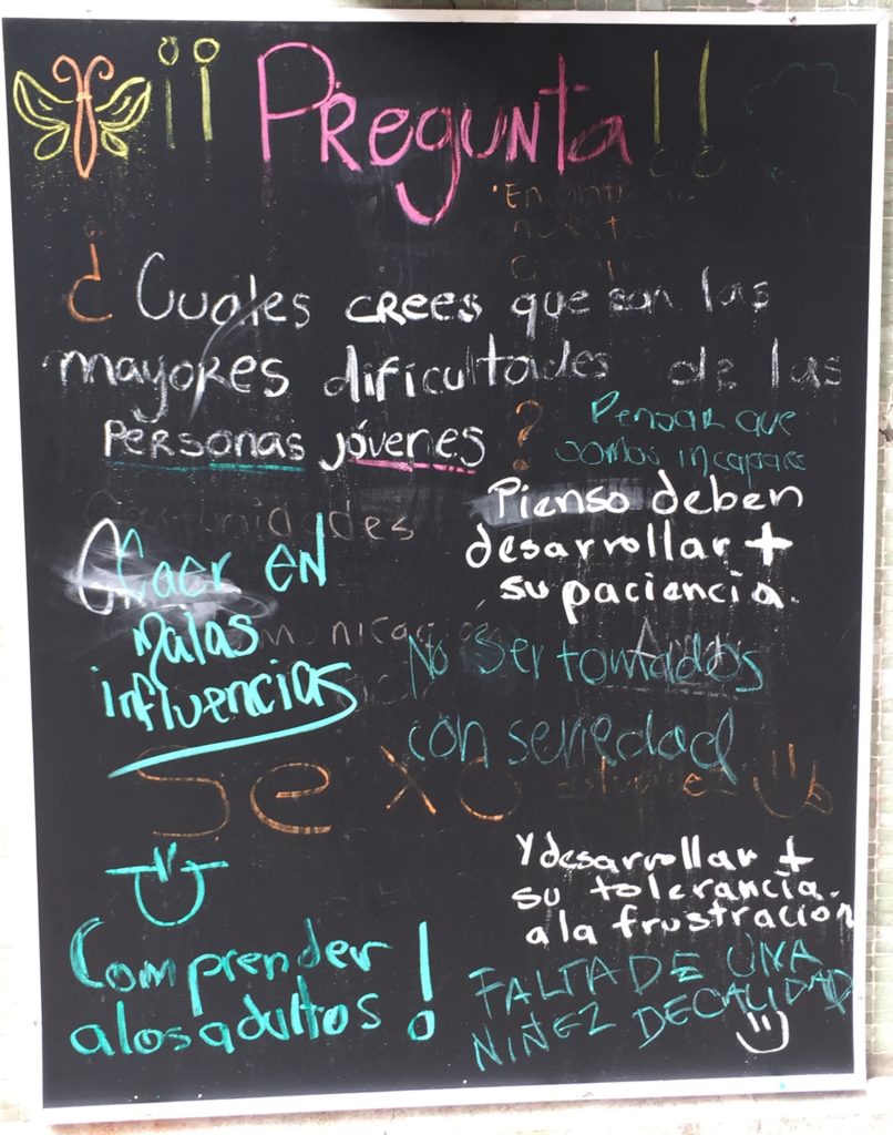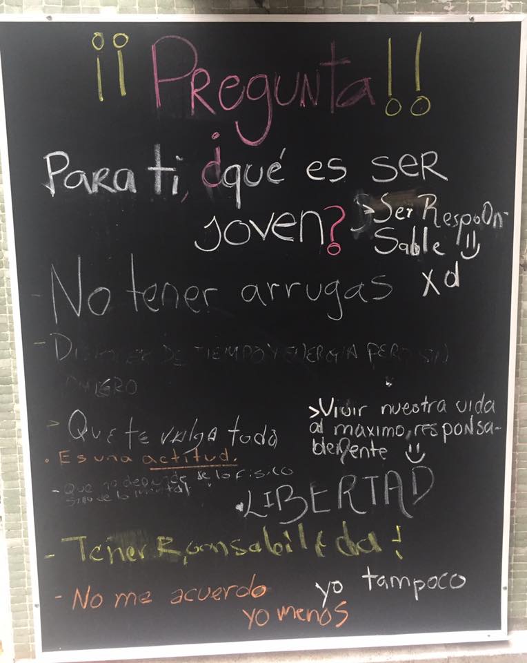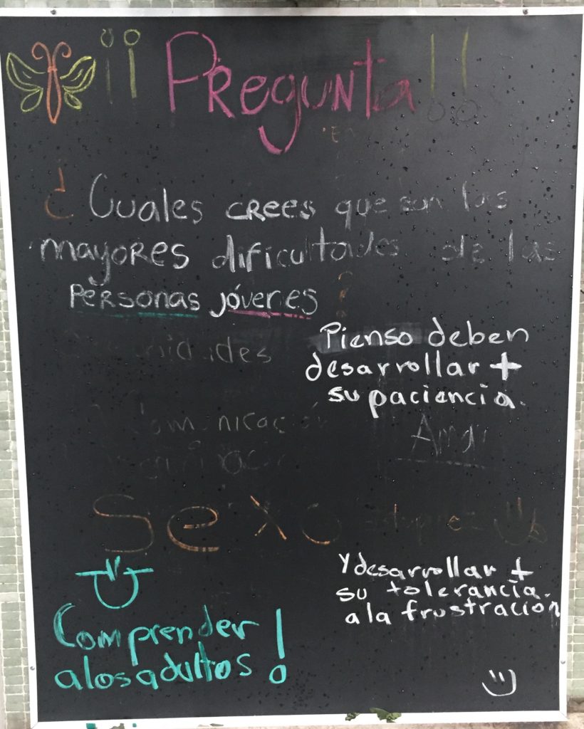 Este mes iniciamos una serie de sondeos con nuestras comunidades física y online. En la fachada de nuestra casa pusimos un pizarrón con preguntas sobre los derechos de las personas jóvenes y el ejercicio de la sexualidad, motivando a quienes transitan por ahí a opinar libre y espontáneamente.